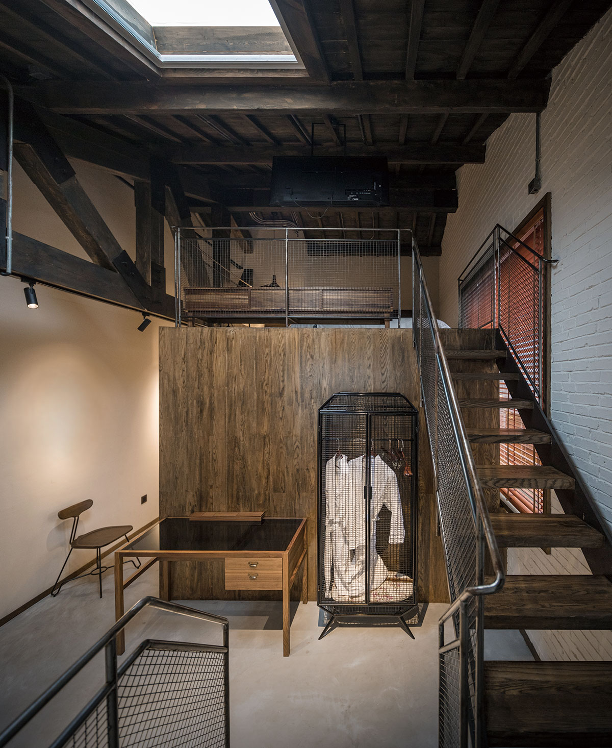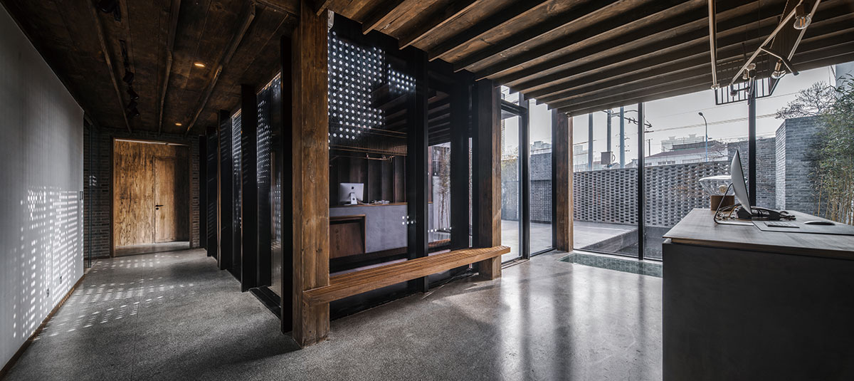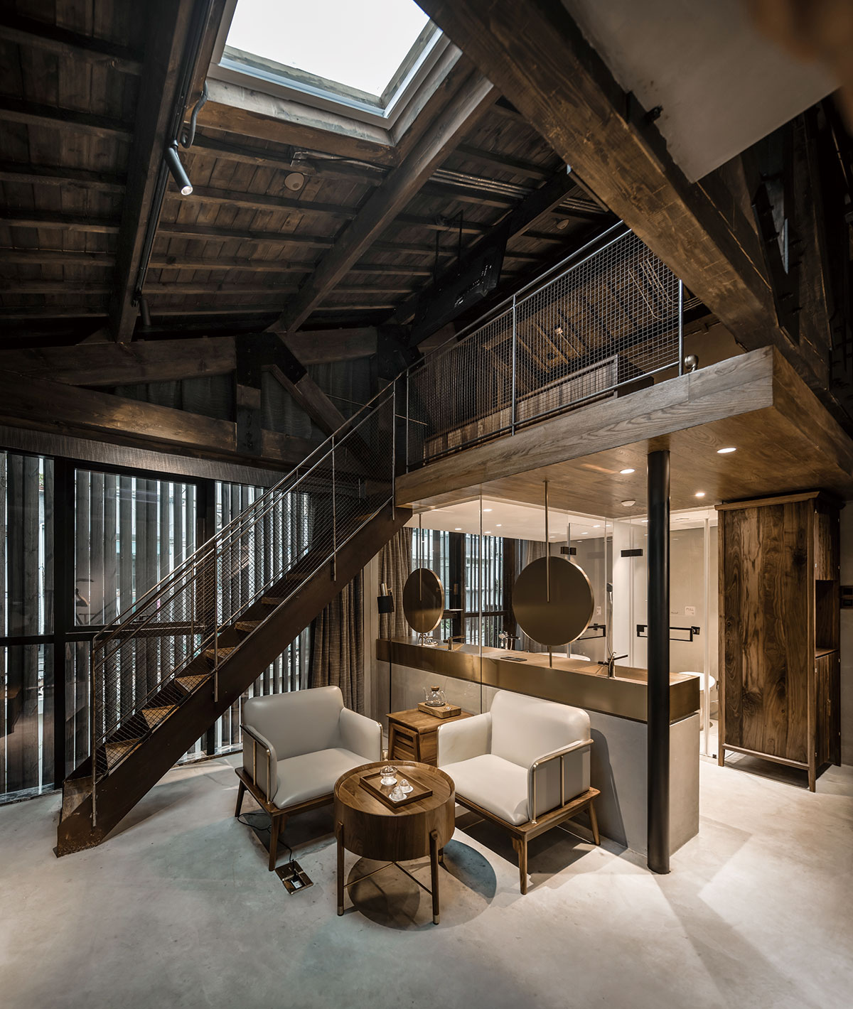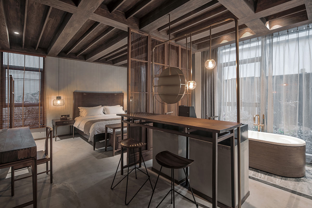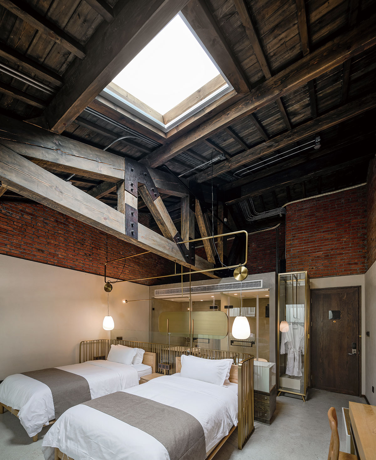 渝舍印象由兩棟樓組成,設計過程從整合的角度梳理了文化、自然、建筑之間的關系。以入口處以折疊巡回的青磚引入,為空間的公共與私密提供了過渡。參考北方的四合院和上海小院的特點,設計師大刀闊斧,在寸土寸金的上海市中心辟出一處院落,解決了建筑間的孤立狀態(tài),使客房、前廳大堂和咖啡廳視覺上遙相呼應,院落的引入集中體現(xiàn)了傳統(tǒng)建筑的造園思想。大片窗戶和鋼板組成干干凈凈的冷色基調(diào),與透出的暖黃光形成對比,正如渝舍印象的經(jīng)營模式:用酒店式的管理方法,民宿的人文情懷去經(jīng)營。這里有書籍、音樂、咖啡和茶,懶懶地坐在舒服的沙發(fā)上,發(fā)呆、看書、聊天,坐上一下午。